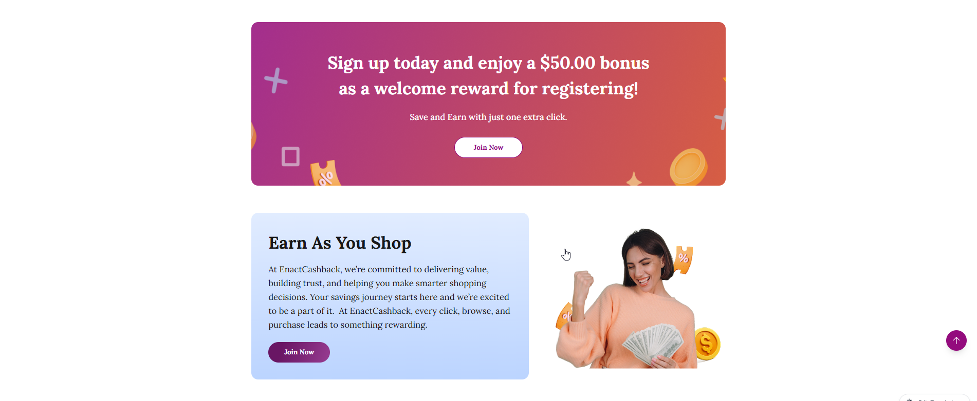 Join Now button encouraging users to sign up and start earning cashback.