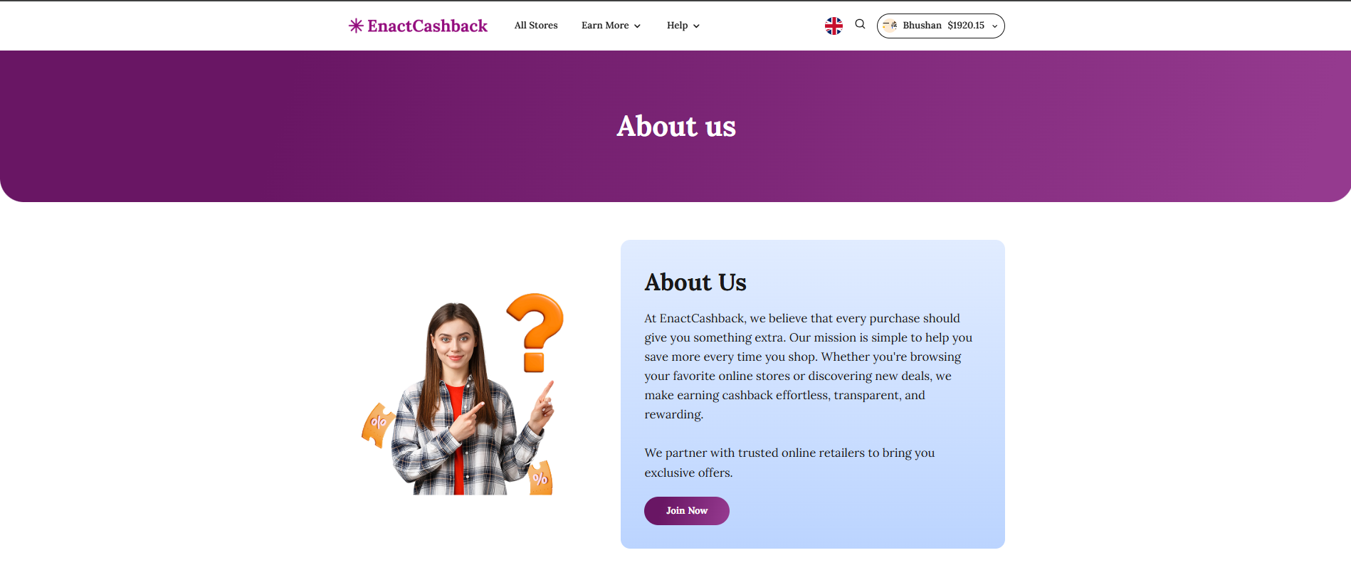 The section explains that EnactCashback aims to make online shopping more rewarding by allowing users to earn cashback on their purchases. It highlights the platform’s goal of helping users save money while discovering deals from trusted online retailers.
