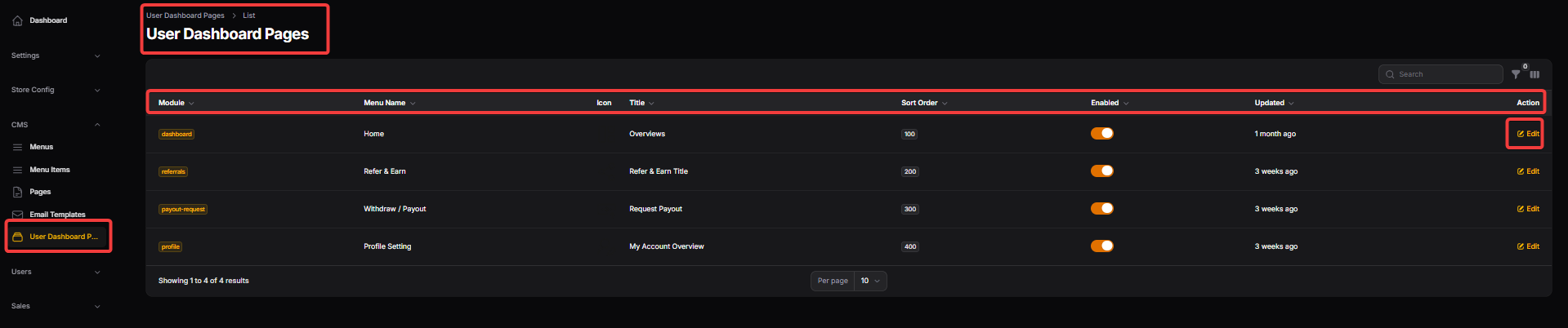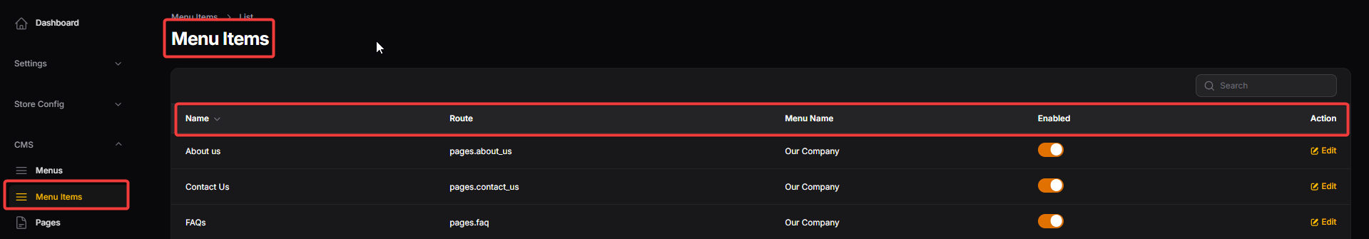 Action: A functional button (e.g., Edit) used by administrators to modify the details or settings of an existing menu item record.
