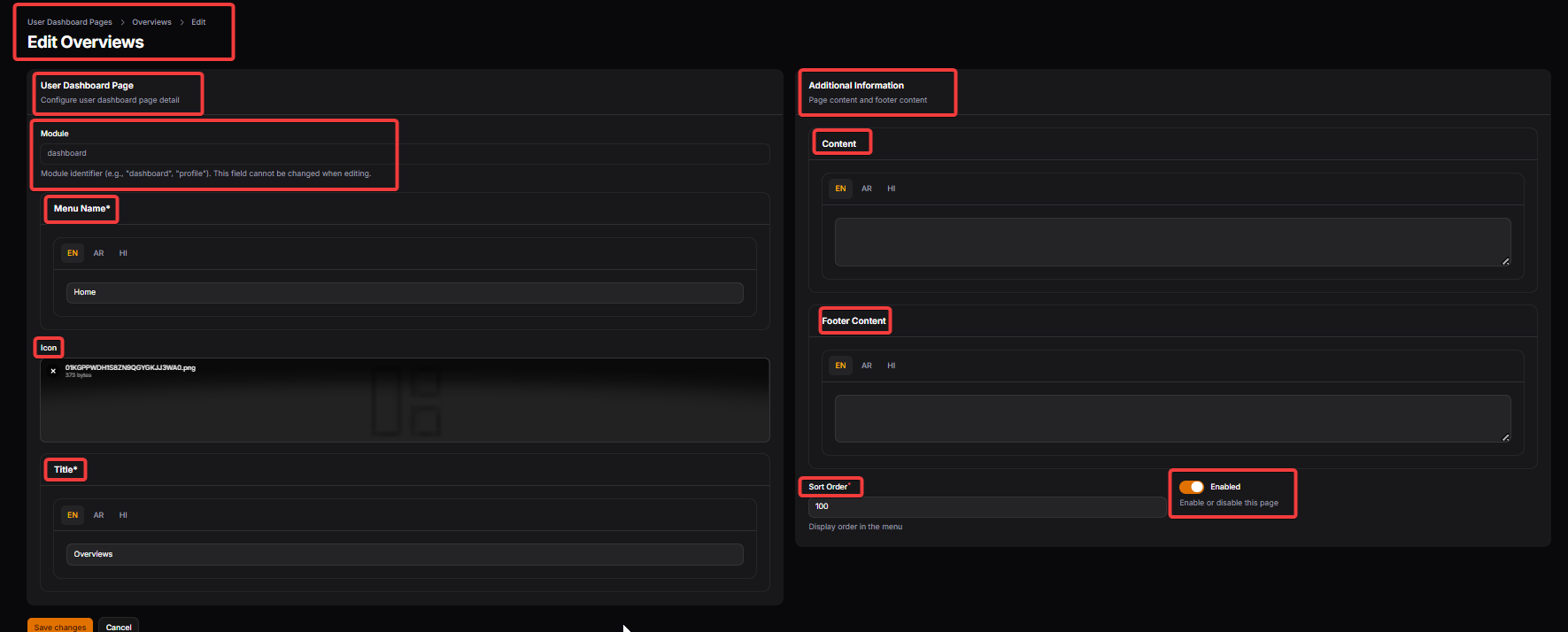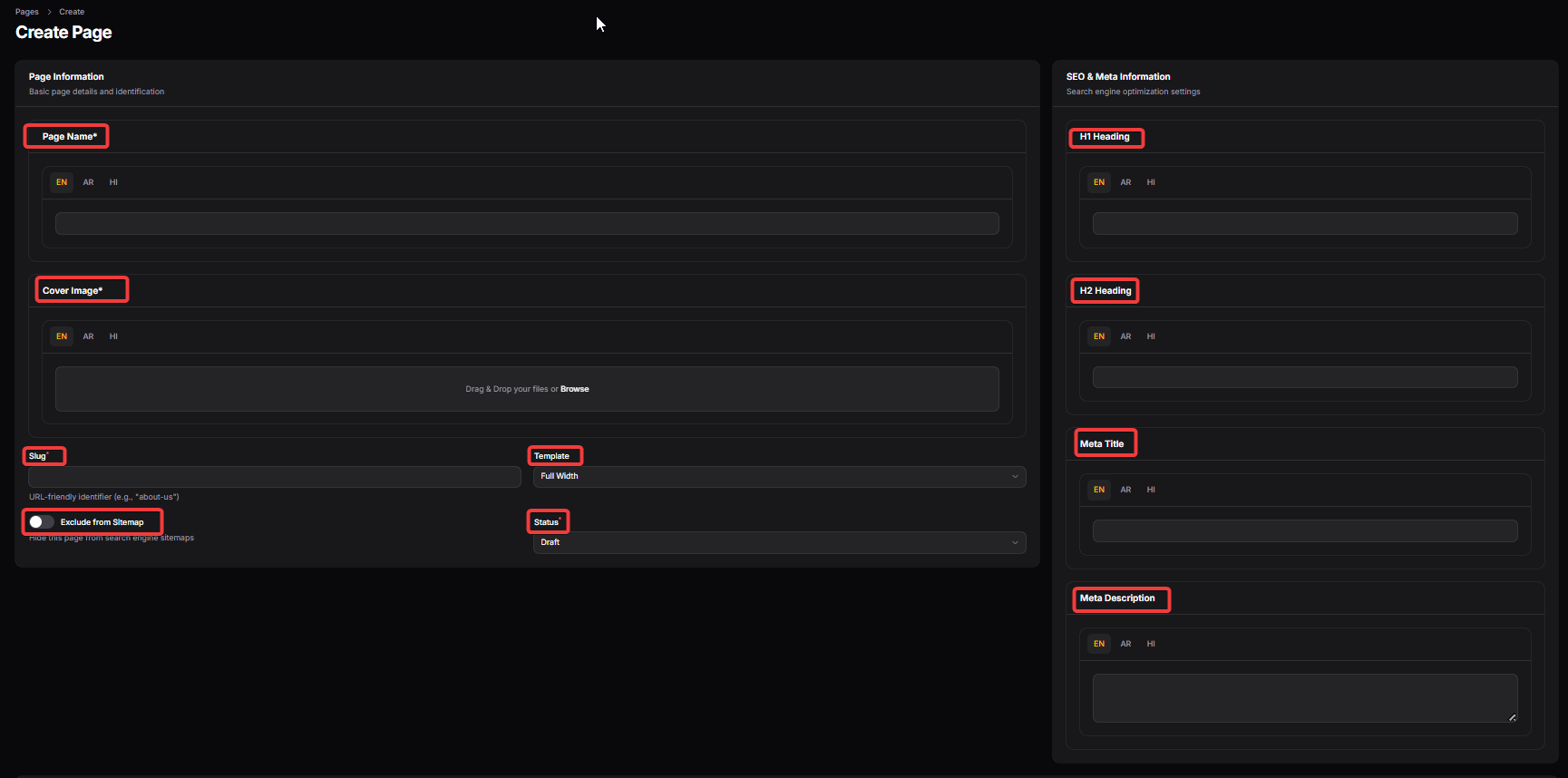 Page Name: The official title of the page used for internal identification and as the primary heading for users (supports multi-language input: EN, AR, HI).