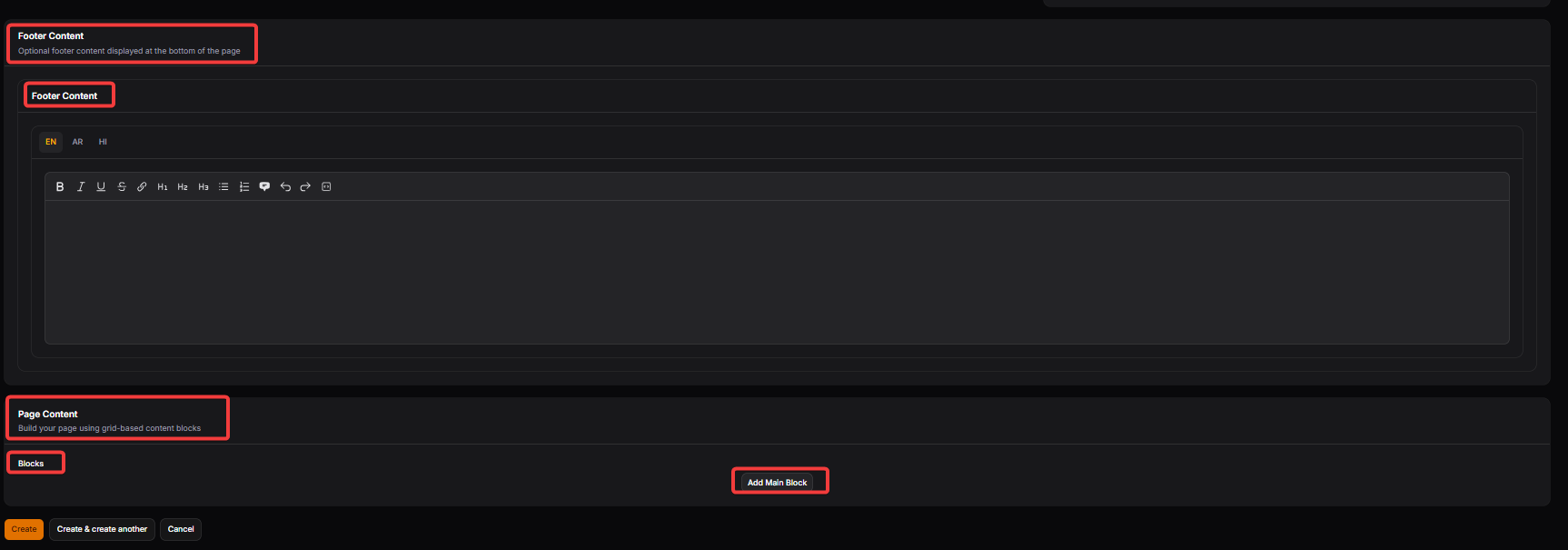 Footer Content (Text Editor): A multi-language rich text editor (supporting EN, AR, HI) used to format and input secondary page information, legal disclaimers, or additional contact details.