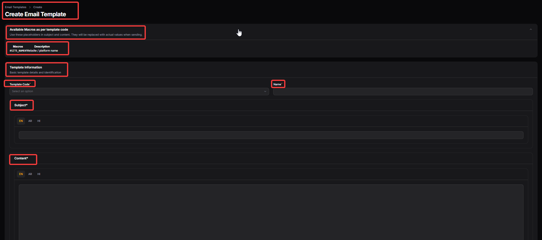 Subject: A multi-language field (EN, AR, HI) where administrators write the email's subject line. Macros can be used here to make the subject dynamic for each recipient.