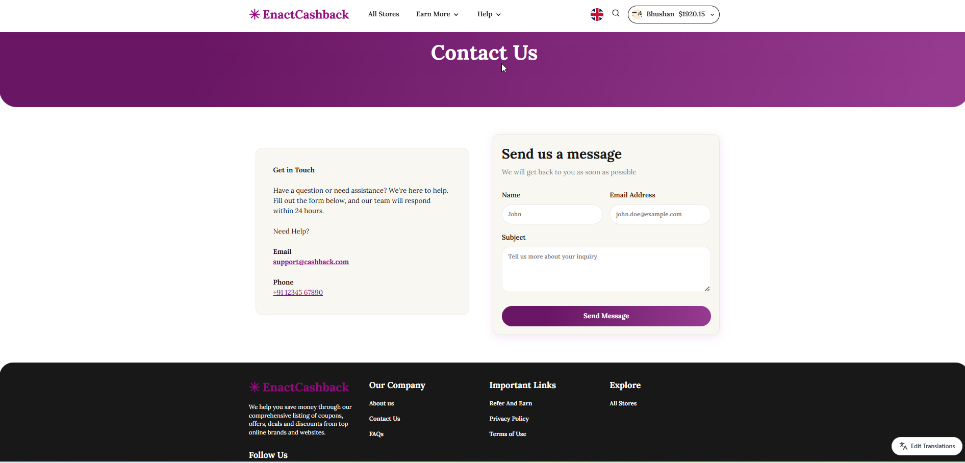 The Contact Us page allows users to reach out to the EnactCashback support team for assistance, inquiries, or feedback. This page provides contact details as well as a form through which users can submit messages directly to the support team.