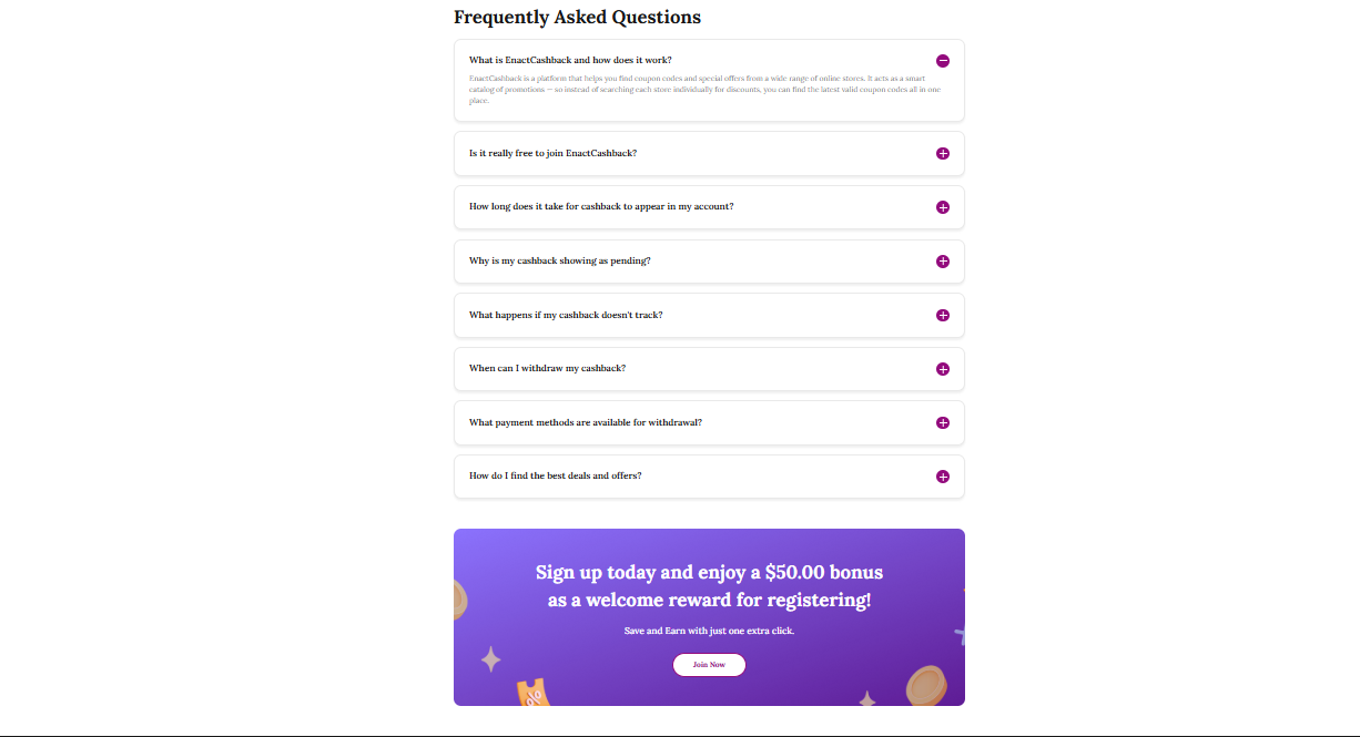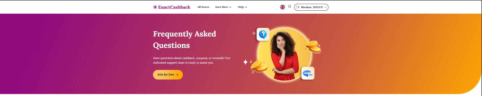 The FAQs (Frequently Asked Questions) page provides answers to common questions related to cashback, coupons, account usage, and withdrawal processes on the EnactCashback platform.