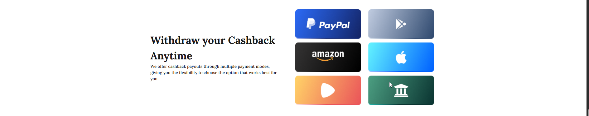Highlights the flexibility of withdrawing cashback through multiple payment options.