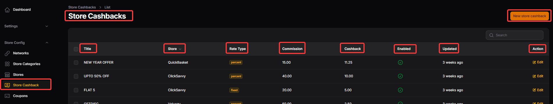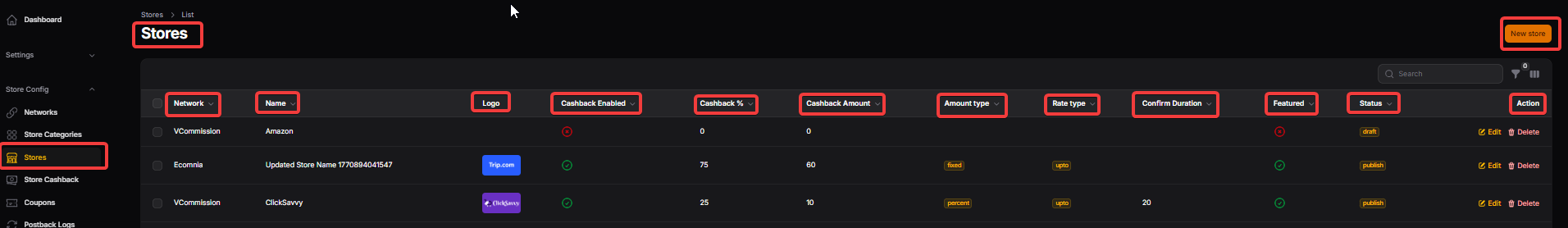 This section is used to manage all cashback stores, including adding or updating stores, configuring cashback rates, and enabling or disabling offers. It also helps track store performance using metrics like clicks and ratings. Bulk edit and CSV import features make it easy to manage a large number of stores efficiently.