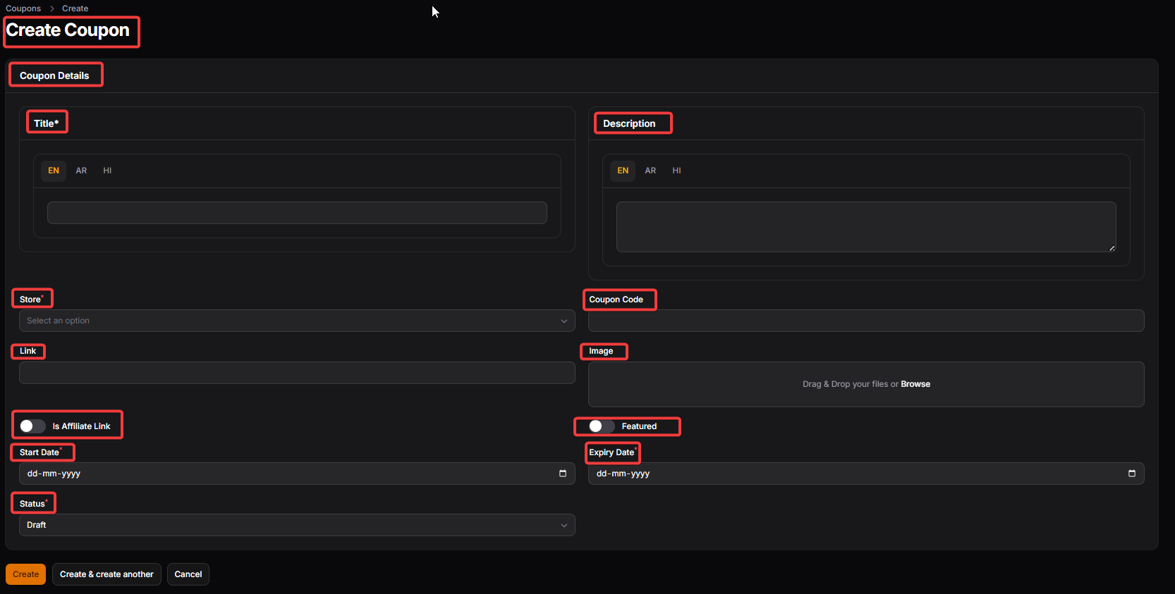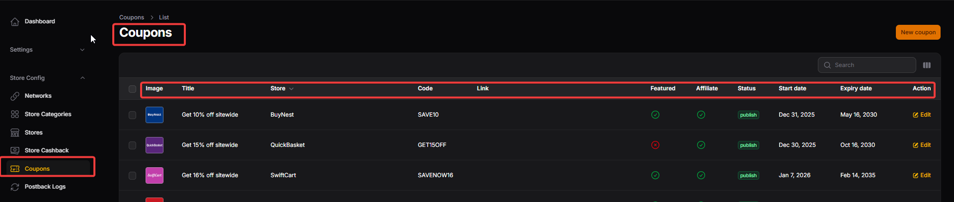 This section allows you to manage and display various coupons received from affiliate networks for specific stores. Proper configuration ensures that these offers are effectively showcased to users, enhancing their shopping experience and potentially increasing conversions.
