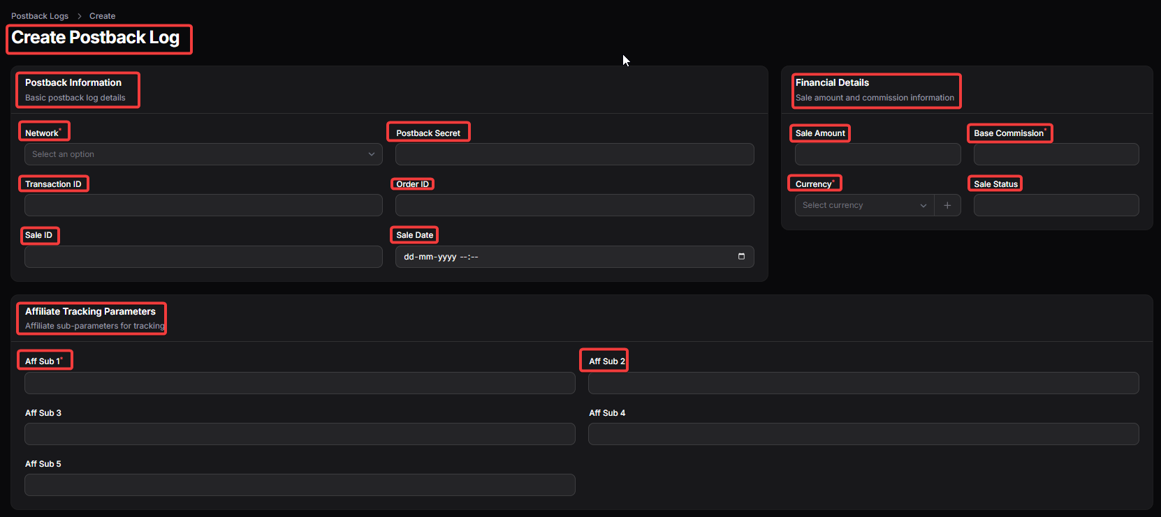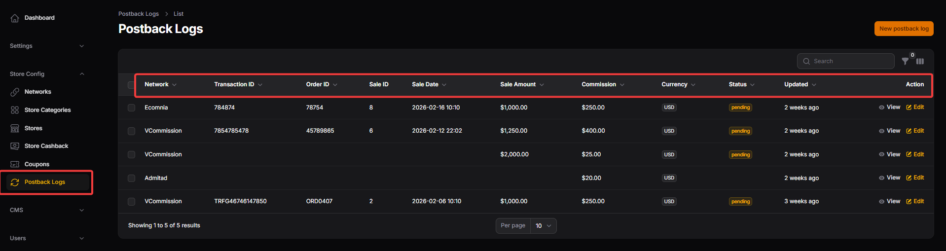 Postback Log records all transaction updates received from affiliate networks through server-to-server (S2S) tracking. It stores detailed information about each sale, commission, and status update sent by the network. This section is essential for validating conversions, tracking commission changes (approved, pending, declined), resolving disputes, and ensuring accurate cashback and revenue calculations within the system.
