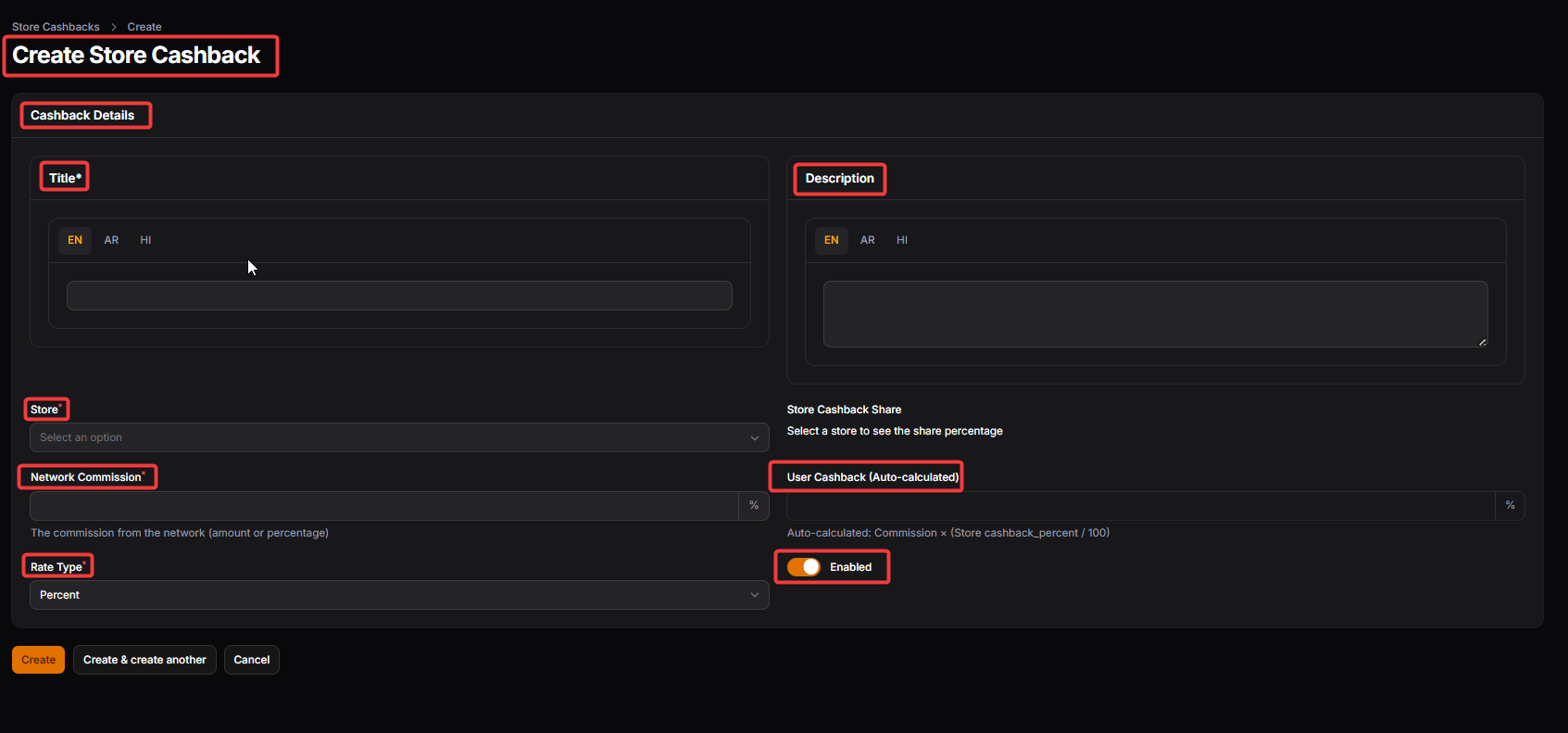 Cashback Amount : Auto-calculated from Store Cashbacks.