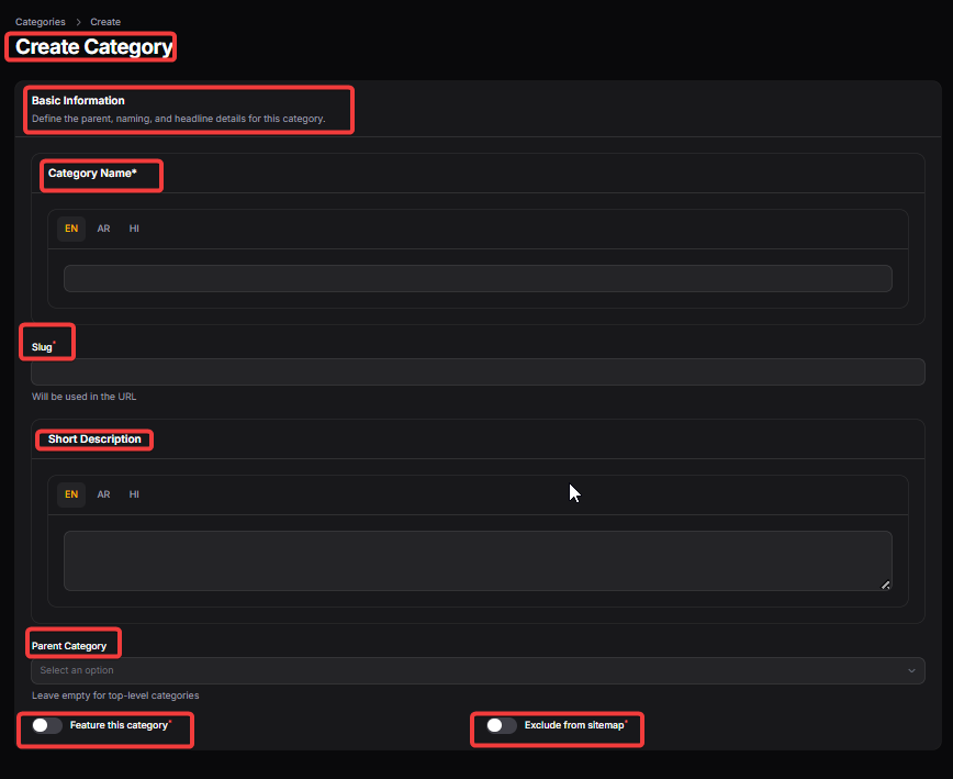 Parent Category: This defines whether the category is a main category or a sub-category under another category.